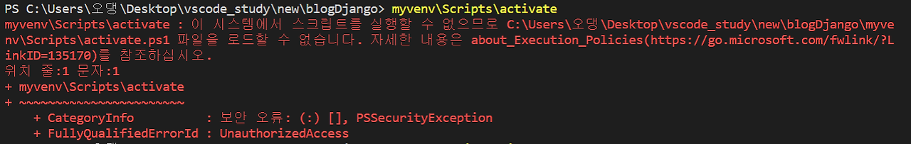 근데 나는 이 과정에서 cmd에서는 무반응이었고, vscode에서는 다음과 같은 에러가 발생했다.