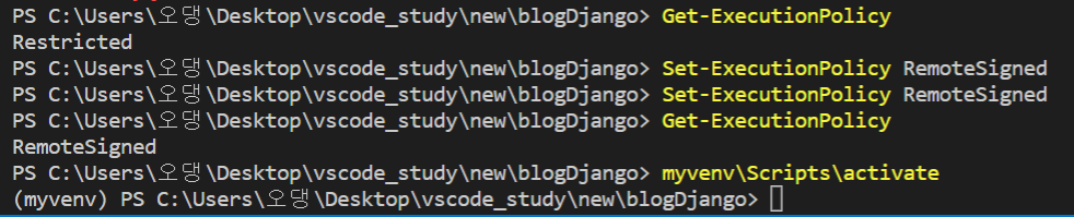 4. Get-ExecutionPolicy 명령어로 다시 한번 확인해 RemoteSigned로 변경 확인