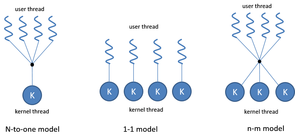 -보통 운영체제는 유저 레벨 스레드와 커널 레벨 스레드 모두 제공한다. 두 스레드간의 관계 모델 유형을 살펴보면 다음과 같이 3가지로 분류할 수 있다.