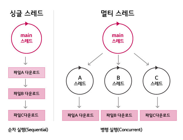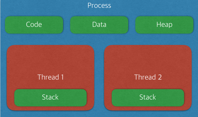 프로그램을 구현할 때 연산량 증가, 모듈화, 편의성 등의 이유로 하나의 작업을 여러 개의 프로세스로 구성하거나 여러 개의 스레드로 구성한다. 전자를 멀티프로세스(multi-process), 후자를 멀티스레드(munlti-thread)라고 한다.